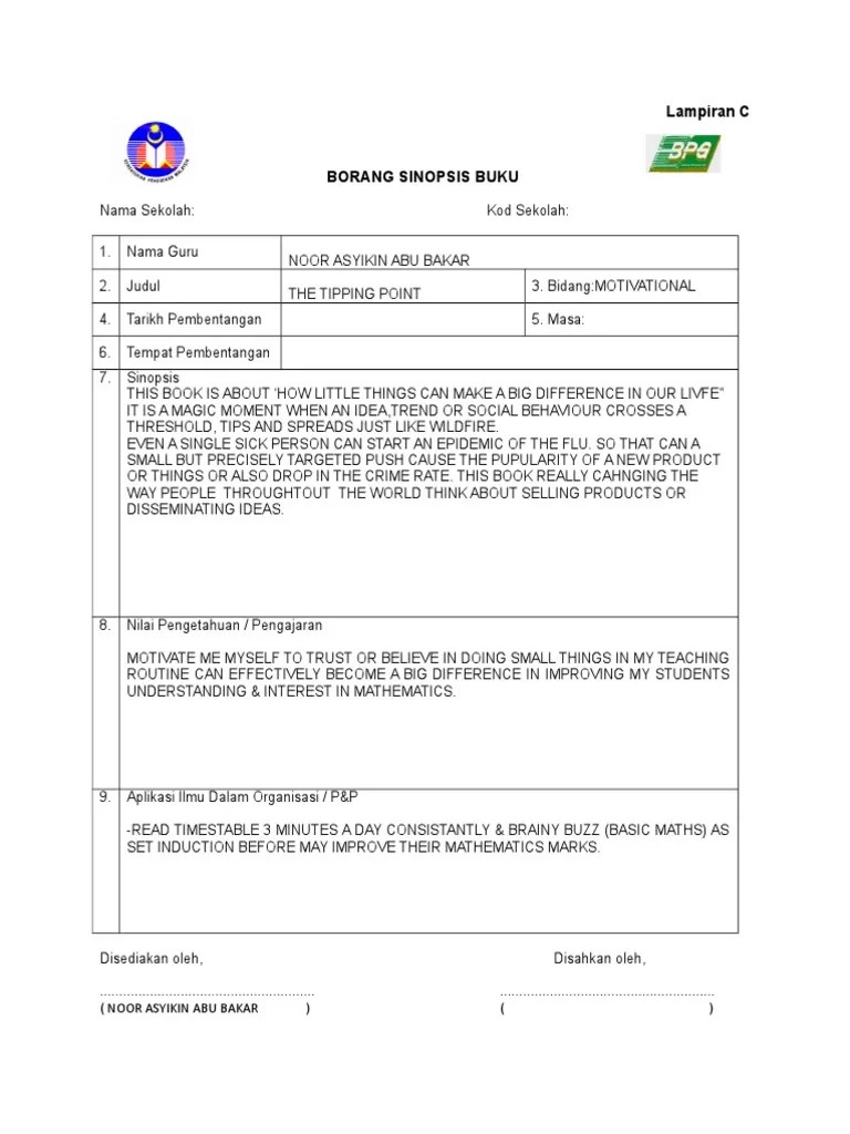 Nurul duraini farhan bt muhamad darawi lampiran c Secara umumnya buku ini sesuai sebagai bacaan para pendidik di sekolah rendah dan menengah dan guru yang berwawasan yang ingin melihat perubahan besar dalam . Buku ini perlu dimiliki oleh para guru sebagai bacaan tambahan yang mana kandungannya akan dapat membantu guru ketika berada . Lampiran c borang sinopsis buku nama sekolah : Langkah mudah rekod pembacaan buku splkpm.